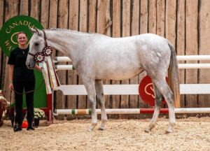 The Young Horse Champion this year was the beautiful grey 2 year old mare bred by Touchstone Farm/Chris Gould. Cherry Blossom by Charmeur (Beaulieu’s Conquest x Heraldik) out of Sakura (Sandakan x Bajazzo). She was also Grand Champion Mare of the show. This mare is LOT 28 in the Fall Classic Breeder’s Sale online October 18-20, 2025 check her out on CLIP MY HORSE TV AUCTIONS. Reserve Young Horse Champion was Ulterra Ivy’s Emerald, 2025 filly by Nuit D”Emerald x Indoctro.